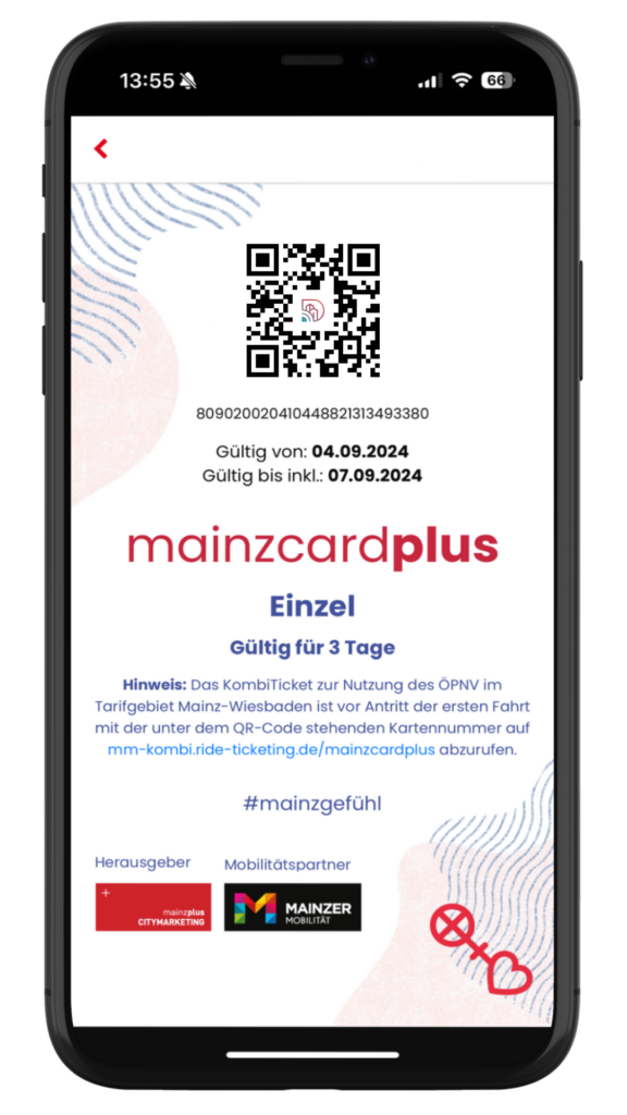 Die mainzcardplus ist für drei Tage gültig. Während dieses Zeitraums bleibt sie in der App sichtbar. Sobald die Gültigkeit abgelaufen ist, wird das Icon in der Navigationsleiste grau. Alle Informationen zum Angebot sind dann weiterhin über das Menü abrufbar.
